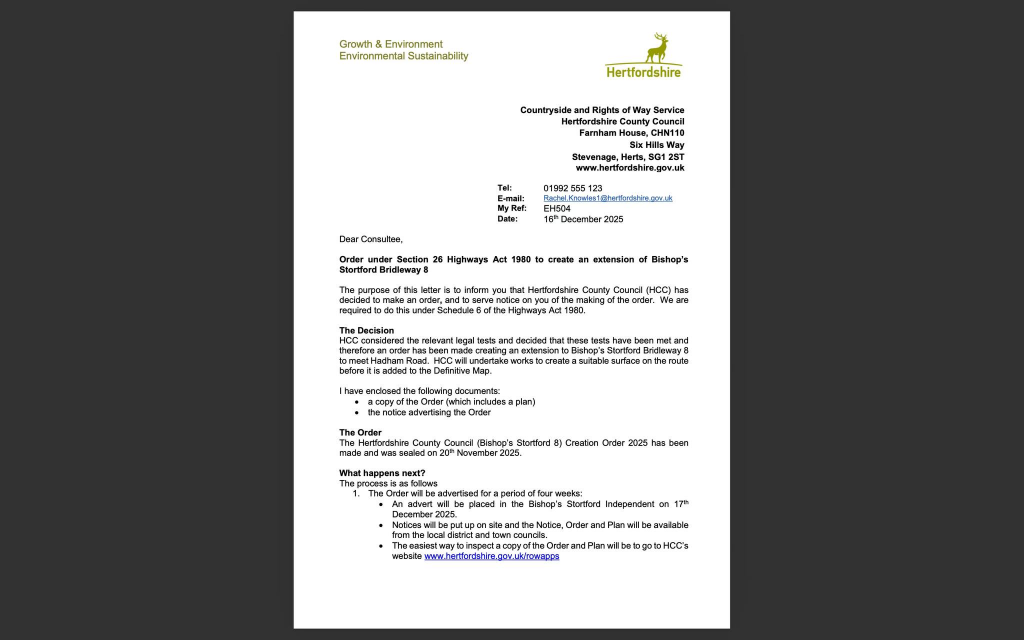 We are very pleased that Herts County Council has made an Order to create an extension to Bishop’s Stortford Bridleway 008. This will create a new section of bridleway from Hadham Road continuing north for 170 metres to link with the existing bridleway.