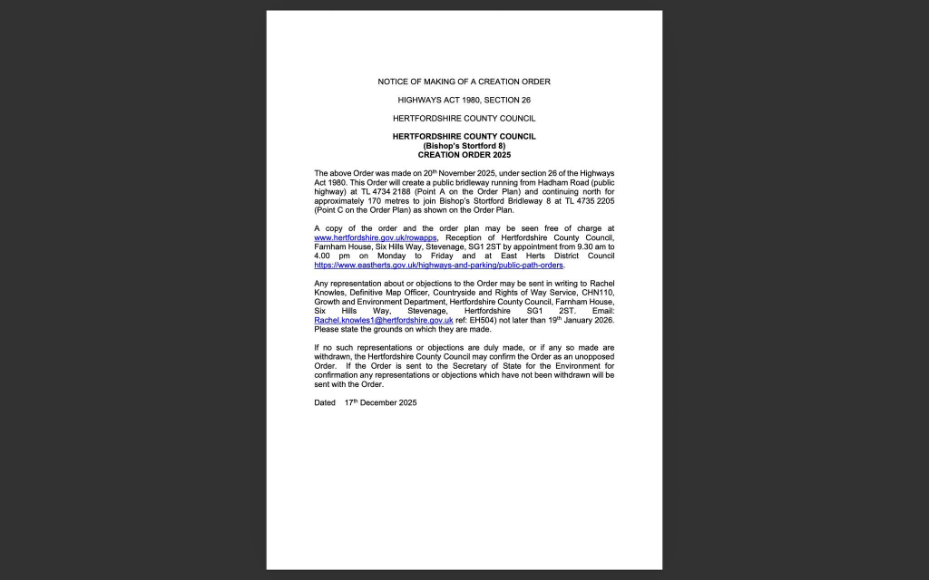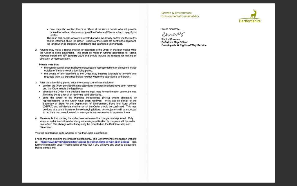 Any representations about or objection to the Order may be sent in writing to the Countryside and Rights of Way Service (CRoW) not later than 19 January 2026. Hopefully, the Order will attract no objections and it can be confirmed unopposed early next year.