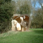 At the top of the field the path takes a short left and right to carry on up a track between paddocks. Pink violets are blooming here in early April. At the road turn left and keep going to the Prince of Wales pub where you turn right along a byway signposted to Bucklers Hall Farm. When you reach the T junction turn right and follow the path straight ahead for half a mile or more with the ditch on your right. You will pass the farm and go round the pond where a patch of butterbur grows with flower heads in April and large leaves later on. Soon you will emerge onto Perry Green and if you need a break the Hoops pub is just round to the left. Our route goes straight across the green to the entrance to the Henry Moore Foundation. The footpath follows the gravelled road through the grounds where several of Henry Moore’s massive sculptures are in clear view. At a corner the path is signed to the right and through a metal gate.